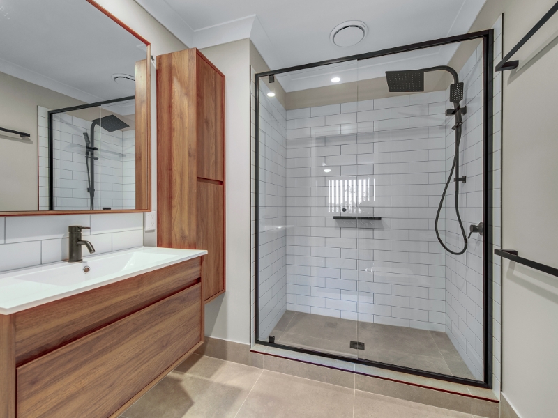 • Matte black tapware, door handles, and accessories for a sleek aesthetic