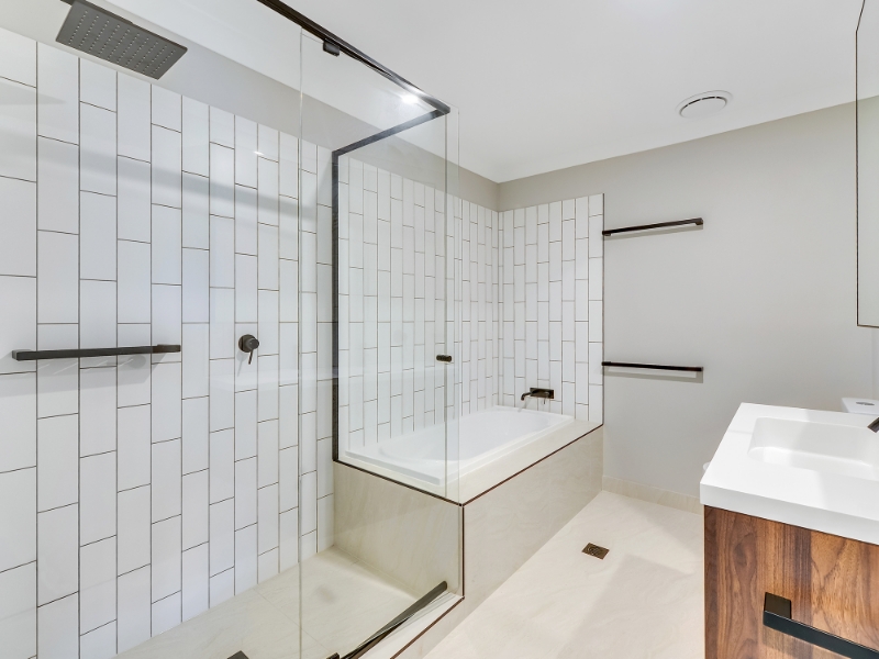 • Free-standing bathtub and wall-hung vanities in bathrooms