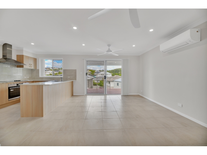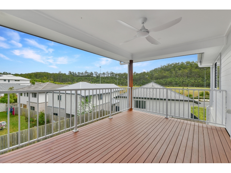 Open-plan living and dining areas connect seamlessly to a spacious timber-decked alfresco with a picturesque outlook over Silver Jubilee Park and the rolling hills of Spring Mountain, providing an inviting setting for entertaining or relaxed everyday living.