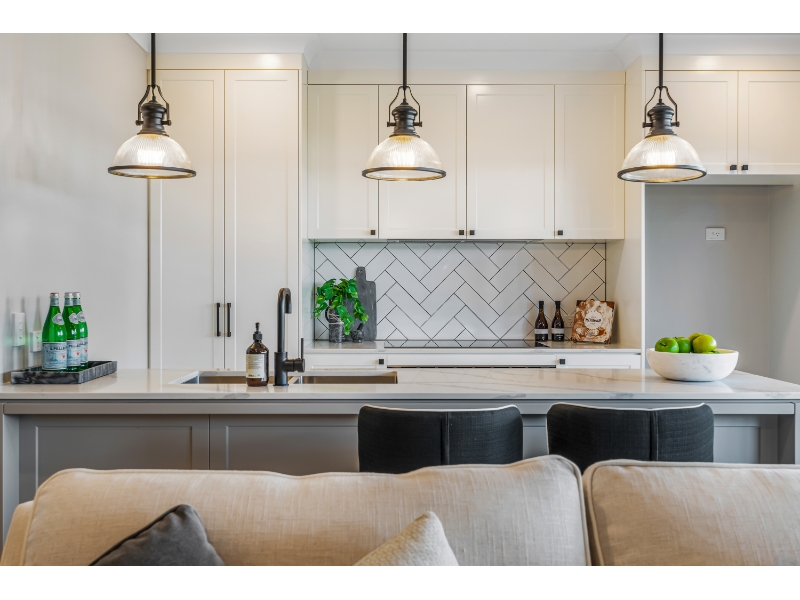 • Open-plan entertainer’s kitchen with stone benchtops and modern finishes.